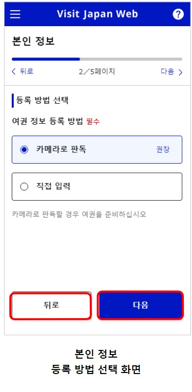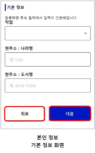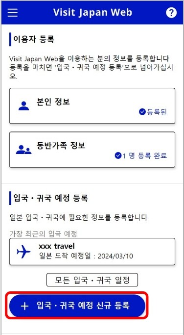 ※본인 정보 등록을 모두 입력하면 상태 표시가 미등록에서 등록 완료로 바뀌고, 여권의 잔존 유효 기간이 6개월 미만이면 여권 잔존 기간 확인이라고 표시됩니다. 또, 여권이 만료된 경우에는 여권 유효 기간 만료일 경과 라고 표시됩니다. 본인 정보를 클릭하여 본인 정보 입국ㆍ귀국 수속 구분 화면으로 넘어갑니다.