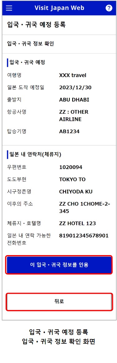 입국, 귀국 예정 신규 등록으로 나의 여행 일정을 등록해야 합니다. '입국, 귀국정보 인용하기'는 '인용하지 않고 등록진행'을 눌러주시면 됩니다. 항공사명은 비행기 예약페이지에서 확인이 가능합니다. 일본 내 체류지는 호텔주소입력하면 됩니다.
